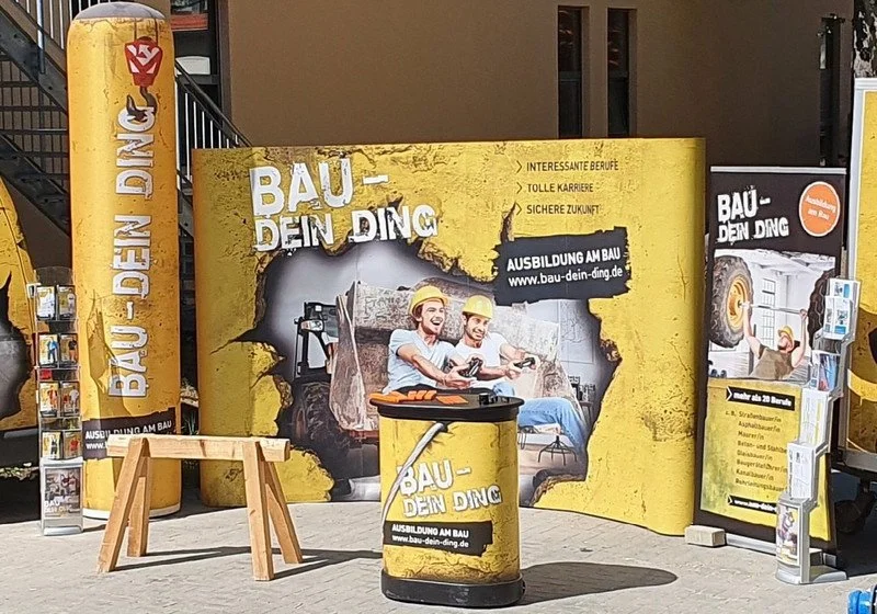 Mit dem MessePaket erhalten Sie einen hochwertigen, aufmerksamkeitsstarken Messestand, der sich leicht aufbauen lässt und auch mit wenig Personal optimal betreut werden kann. Messecounter und -wand im „Bau – Dein Ding“-Design, ein Bildschirm für Ihre digitalen Inhalte sowie Sitzwürfel schaffen eine einladende und professionelle Atmosphäre.